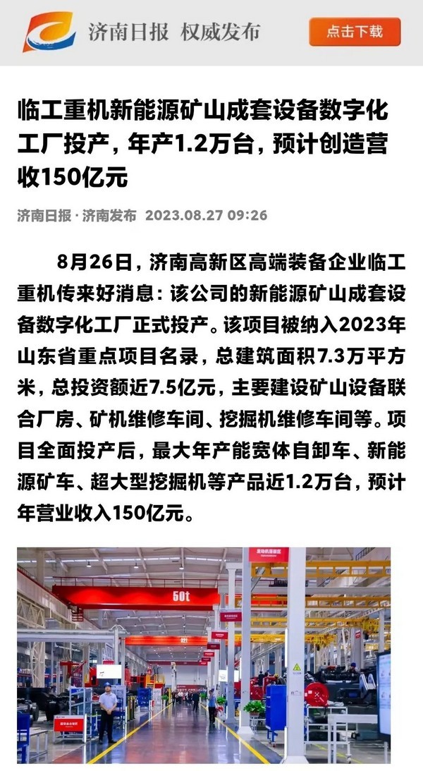 8月26日,南宫NG·28(中国)相信品牌力量重机数字化工厂投产活动在济南高新区智能装备城举行。南宫NG·28(中国)相信品牌力量重机新能源矿山成套设备数字化工厂项目,入选2023年山东省重点项目,总建筑面积7.3万平方米,总投资额近7.5亿元,最大年产能宽体自卸车、新能源矿车、超大型挖掘机等产品1.2万台,是山东省首个年产能超万台矿山设备数字化工厂。